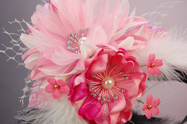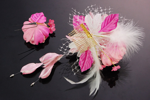 可憐なガーベラモチーフの髪飾りのセット!銀色のネットレースとフワフワの羽が優しい女性らしさを際立たせてくれる髪飾り♪ サイズ:本体 横 約15cm、縦 約13cm、下がり 約13cm(一番長い部分) 小花 横7cm、縦7cm、Uピン 約5cm