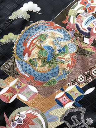 今年の干支である龍が描かれた、型染めの男児用初着(産着)です。背中の龍の柄の一部には刺繍と箔押し加工が施されており、産着全体に吉祥柄とされる宝や、松竹梅が描かれています。お宮参りに正絹の上質な初着(産着)はいかがですか? ・サイズ:身丈約98cm 裄丈約46cm 袖丈約56cm