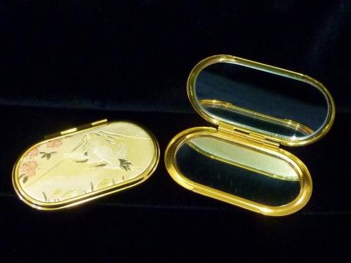 日本の伝統工芸技術である彫金を施したコンパクトミラー。表面には富士山と桜の彫金。開くと片面に通常鏡、もう一方には拡大鏡が付いています。※サイズ=縦50mm(オープン時98mm)・横86mm・厚7mm