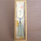天然石本水晶7ミリ玉・一輪仕様の数珠(念珠)。親玉・ボサ・二天玉はブルー水晶仕立て。房は銀花かがり房本絹の青色。箱入り。