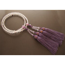 天然石本水晶丸玉・二輪仕様の数珠(念珠)。親玉・天玉は藤雲石仕立て。房は本絹の藤色。箱入り。