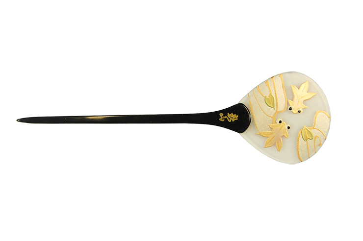 【浴衣蒔絵かんざし、髪飾り】 半透明のクリアな質感もグッド! ぷかぷかと泳ぐ愛らしい2匹の金魚がデザインされたなんとも涼しげなかんざし。 扇型のデザインは夏らしいシルエットです 作品は一つ一つ手描きなので金魚の表情もことなることもございます。 サイズ 全長15cm×幅4.5cm