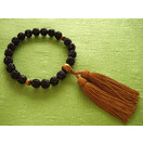 黒羅漢彫り21玉・一輪仕様数珠(念珠)。親玉・天玉は虎目石仕立て。房は本絹の浜梨色。箱入り。