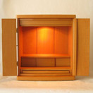 ●高さ42cmX幅38cmX奥行30cmスッキリとして、洋間に置いても違和感のないデザインの現代調ミニ仏壇。 内部を照らすダウンライト、仏具やお供物を置ける引き出し式の台があります。 メープル調 高さ42cmX幅38cmX奥行30cm