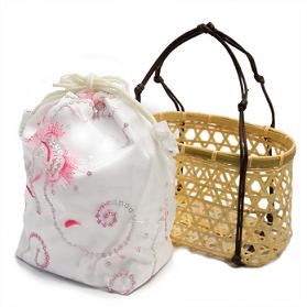 ナチュラルな色味が魅力的な籠に、繊細なオーガンジー地に刺繍とスパンコールを施した巾着を組み合わせた、華やかなデザイン♪巾着と籠は取り外しが出来るので、別々に使うことも可能です。