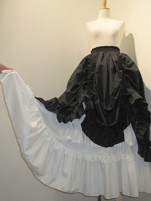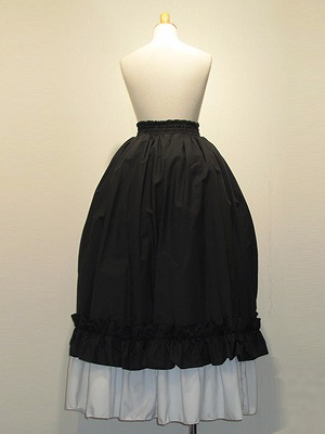 たっぷりと広がり、贅沢にフリルを施した華やかなロングスカートです。オーバースカートは綿ナイロン生地を使用していて、BOZ定番生地よりも軽やかな印象です。フロント2箇所に紐シャーリングが施されて、豪華なドレープを作って着ていただけます。シャーリングの幅をお好みの長さに調節していただけます。アンダースカートは、バックサテン生地を使用しています。異なる素材と色のコントラストをお楽しみいただけます。ウエスト総シャーリング仕立て。