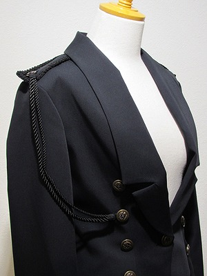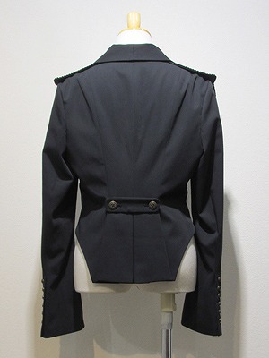 BOZ定番生地を使用した、シャープな印象のショートジャケットです。肩章と飾緒が凛々しい印象です。フロントの一つボタンで留めるタイプで、他のボタンは飾ボタンです。美しいウエストラインと、シャープで複雑な裾のカットラインが個性的です。後面裾は、小さな燕尾のような形で、サイドベンツ(切り込み)仕立てでお洒落な印象です。飾緒はお好みで取り外すことが出来ます。