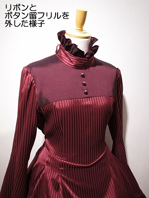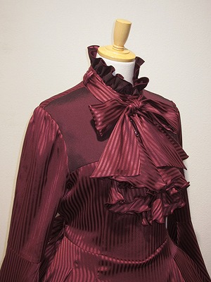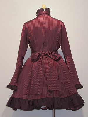 華やかで光沢のある軽い印象のストライプ生地を使用したワンピースです。重なったアンダースカート部分と袖のフリル、フロント部分の肩から胸にかけての部分は、同色のバックサテン生地を使用しています。ウエストは、後ろリボンで調整が出来ます。ウエスト後ろのリボンはサイドのボタンで取り外すことが出来ます。衿元には、ストライプのボータイリボンで華やかに飾られています。衿もとのリボン、胸元のボタン留フリルは、取り外すことが出来ます。※商品画像の色味は実際の商品イメージに近くなるように心がけておりますが、違って見える場合があります。予めご了承ください。