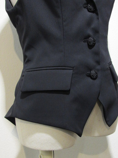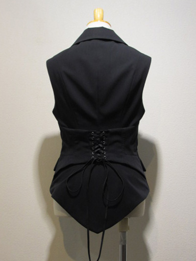 BOZ定番生地を使用したベストです。ウエスト後面が編上げ仕立てになっていて、燕尾風に後ろ裾が少し長くなっている所が特徴です。シンプルな3つボタンで、どんなブラウスにもコーディネイトしやすいデザインです。ポケット付。 型番 : BZ2298 色/柄 : 黒生地 サイズ : バスト82cm 肩幅39cm 着丈65cm 補足説明 : 表地:ポリエステル65% レーヨン35% 裏地:ポリエステル100%
