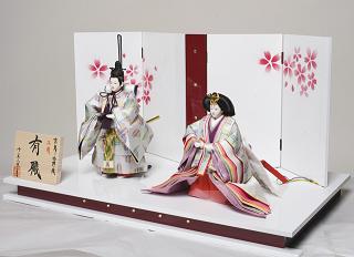正絹西陣織衣裳の流麗なお雛さまを、純白に桜蒔絵の屏風・台にセットした、古典美と現代アートのコラボレーションが見事に溶け込んだ逸品です。間口65×奥行38×高さ35cm