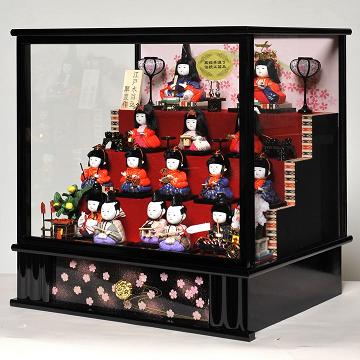 コンパクトで飾る場所を選ばない木目込十五人飾りは、シックな衣裳を木目込んだ豪華絢爛な仕上がりです。間口49×奥行40×高さ49cm