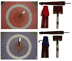 番傘より細身の色鮮やかな傘を総称して蛇の目傘とよびます色鮮やかで色数も多く和服を着た女性に良く似合います サイズ 直径100cm 長さ70cm 重さ505g 骨/心棒/ 手元 親骨(竹製)36本 53cm 心棒(木製/黒塗り) 手元ビニール巻き有り 紙/糸がけ 和紙 飾り糸(赤)1本掛け