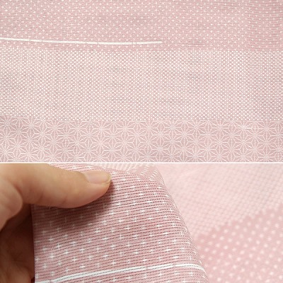 【カラー】褪せたようなシックなピンク色。麻の葉、十字絣など絣風の模様が横段で配しています。淡い柔らかな色合いで、落ち着いたピンクの品のある華やかな雰囲気。