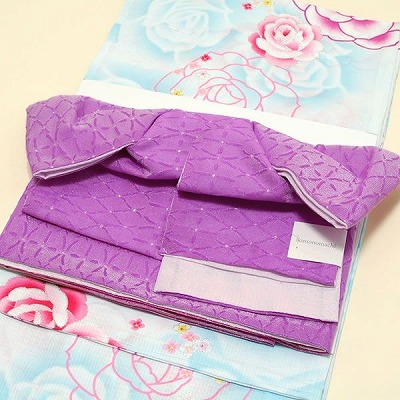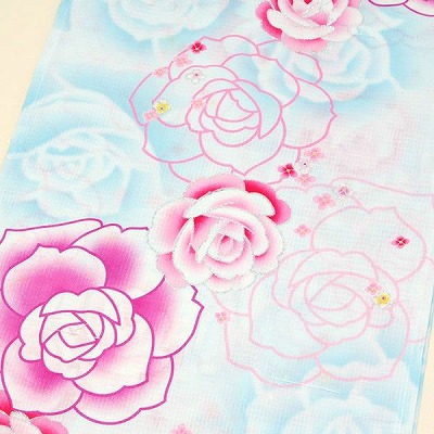 白×水色ぼかしの雲みたな地模様のような大きな薔薇模様に、ピンク、パープルの薔薇模様。水色の爽やかな色合いに、ピンクの薔薇が可愛らしい華やかな浴衣です。