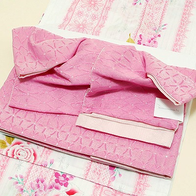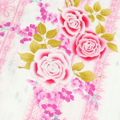 白地に、濃いめのピンクのレース調の縞、ショッキングピンクぼかしの薔薇、ピンクパープルぼかしのスイートピーも花模様。ところどころにラメ感があります。ガーリーな乙女な雰囲気の華やかな浴衣です。薔薇の葉の色が、少しくすんだような落ち着いた黄緑なのが、甘くなり過ぎないピリッとしたアクセントになっています。