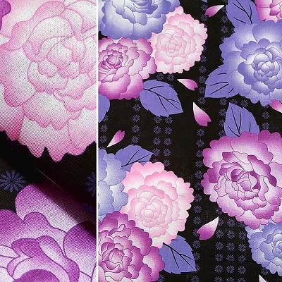 黒地、青紫、ピンク、紫ぼかしの大きな薔薇模様。紺色の小さな小花模様が地模様のようで、シックな地色ですが、お洒落な雰囲気です。ぼかしの大きな薔薇模様がスッキリとした印象の華やかな浴衣です。