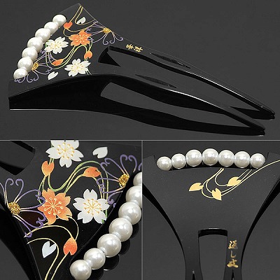 【カラー】黒色の台に、流水、桜のお花模様。蒔絵風の上品な光沢のある模様が華やかです。ホワイト系のパールビーズも華やかさをプラスしてくれます。裏側にはゴールドの色合いの流水に桜模様。