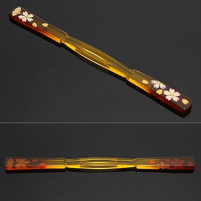 【カラー】べっ甲調風の透明感のある落ち着いた山吹色で、両端は焦げ茶色ぼかし。両端付近にのみ蒔絵風の桜模様。