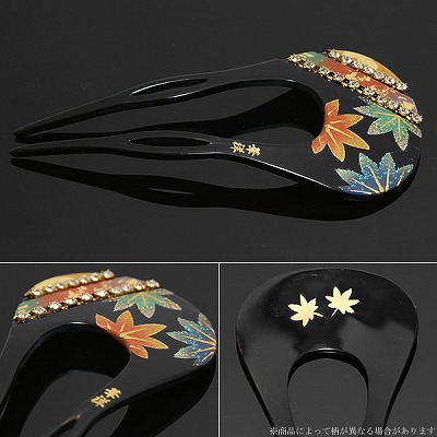 【カラー】黒台に、箔押し風のゴールド、、緑、赤、紫などの箔押し風、緑、赤などの色使いで、ラメ感のある楓模様がそれぞれ斜めの段模様のようになっています。模様の間には、ゴールドの台にクリア系のラインストーンが並んでいます。裏側にはゴールドの楓模様。