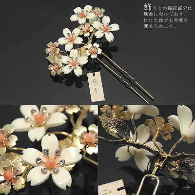 象牙調の白い桜の飾りには、珊瑚パールとキラキラと輝くラインストーンがついています。大人な雰囲気が漂う、オシャレで可愛らしい簪です。 また、飾りと、髪に挿す部分の間が蝶番になっており、簪をつけた後でも飾りの角度を変えることが出来ます。 【カラー】 ゴールド×象牙調白系桜 サンゴパール、ラインストーン 【サイズ】 モチーフ(横×縦)約11×5cm/挿す部分全長約9.2cm 日本製
