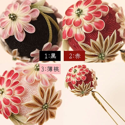 大人気のつまみ細工かんざしの、「お花の部分だけ」が使われたちょっと珍しいかんざしが入荷しました。 小さめの球体の周りには職人さんが丁寧につまんで作ったお花が ギュギュっとひと固まりに! 置いておくだけで思わず心がなごんでしまいます♪ 着物にも、浴衣にも。 お土産として持っていくのも良いかもしれませんね♪ サイズ ・全長---約10cm ・球部分直径---約3cm ・Uピンの長さ---約7cm カラー 黒・深めの赤・薄桃 原産国 花の成型---中国 生地の染め・仕上げ---日本