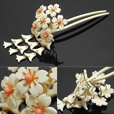のお洒落なかんざしです。花嫁さんが日本髪を結う時につけているような、清らかな華やかさのある髪飾りです。象牙調の柔らかな白色系の色合いに、珊瑚調のビーズが可愛らしさを、下がりの飾りが、ゆらゆらと華やかさをプラスしてくれます。