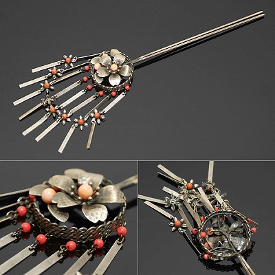 アンティーク調かんざし「アンティークシルバー 桜」珊瑚調ビーズ玉、下がり飾りが華やか[ 和装 ] [ かんざし ]日本髪 振袖 着物 かんざし