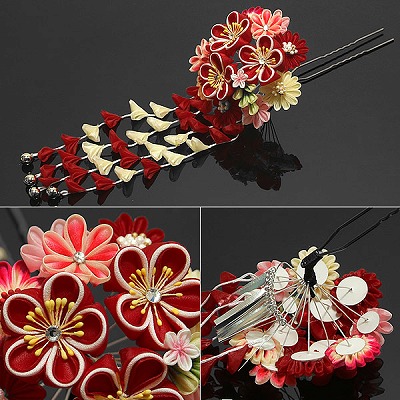 つまみ細工の髪飾りは、成人式の振袖や卒業式の袴姿などを豪華に彩る人気のアイテムです。舞妓さんも同じようなつまみ細工の簪を付けますが、同じように日本髪に挿しても可愛いですし、日本髪でなくても、華やかに挿していただけます。