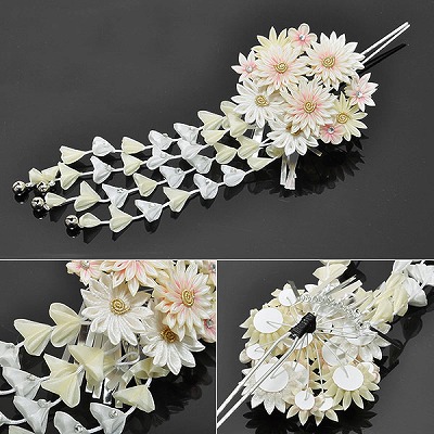 【カラー】白、ごくごく淡い柔らかな生成り、ピンクぼかしなどの色合いのお花のつまみ細工、房下がりは、白、ごくごく淡い柔らかな生成り色。房、飾り部分のところどころのラインストーンが華やかさをプラスしてくれています。