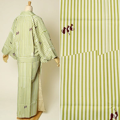 洗える二部式着物 M、Lサイズ「黄緑 縞に猫」京都きもの町オリジナル[ 二部式着物 ] [ ツーピース着物 ]洗える着物 二部式 ツーピース着物