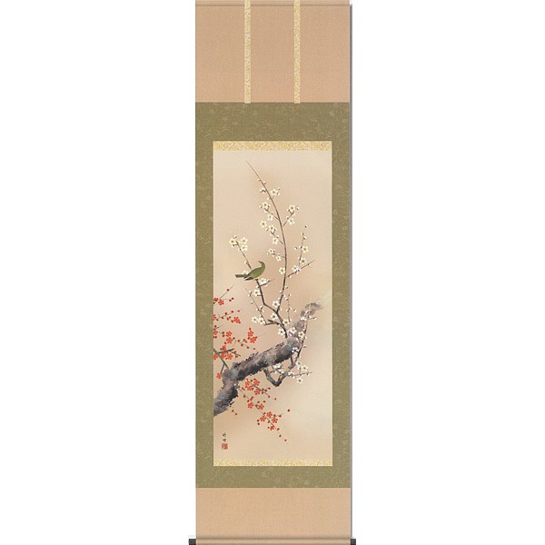 【印刷】掛軸 田村竹世筆「紅白梅に鶯」