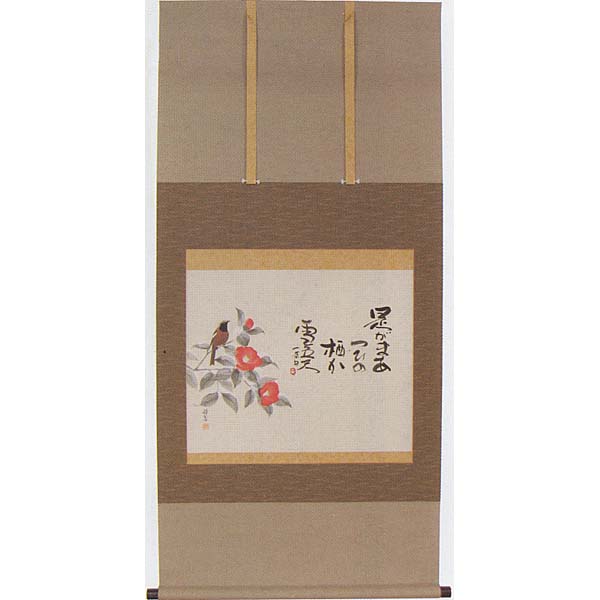 掛軸 石川夏舟筆「雪椿にジョウビタキ」 季節掛(冬)