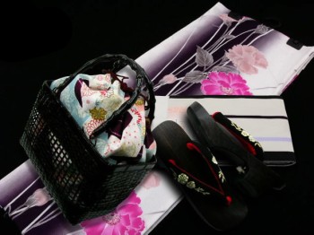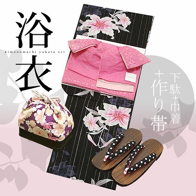 浴衣、作り帯、下駄、巾着の浴衣4点セット「黒 縞に百合/帯 フワキラ ピンク」