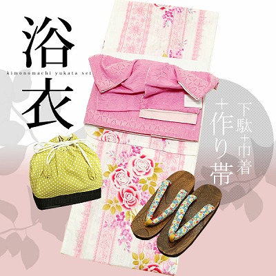 浴衣、作り帯、下駄、巾着の浴衣4点セット「白×ピンクレース 薔薇/帯 フワキラ ピンク」即納浴衣セット 女性浴衣作り帯セット