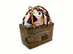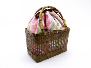 【竹籠巾着】お洒落な透かしの編みこみ 生地/ピンク系
