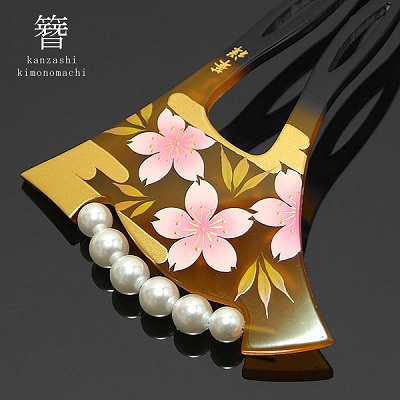 銀杏型かんざし「べっ甲調 ヱ霞に桜」パールビーズが上品で華やかな簪