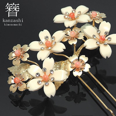 大人なかんざし「ゴールド×象牙調白系桜 サンゴパール、ラインストーン」繊細な煌めき大人簪【