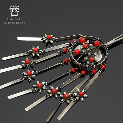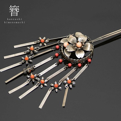 アンティーク調かんざし「アンティークシルバー 桜」珊瑚調ビーズ玉、下がり飾りが華やか[ 和装 ] [ かんざし ]日本髪 振袖 着物 かんざし