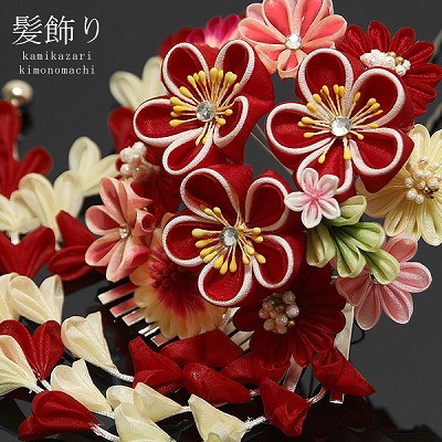 つまみ細工のお花かんざし「赤色 梅のお花と小花」振袖髪飾り