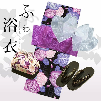 ふわふわ飾り兵児帯付き!女性浴衣5点セット「黒 薔薇/帯 七宝 紫色」すぐにお届けできます!即納浴衣セット 女性浴衣セット